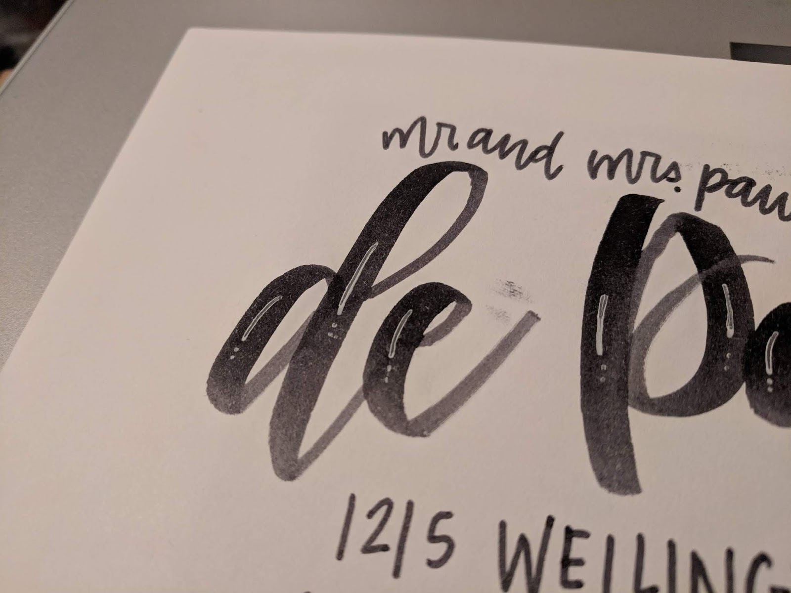 I think my favorite item from that list is my sand eraser. I love it and use it all the time with my lettering. I just finished Christmas cards and they were hand lettered. However, because I am a lefty, I am forever dragging my hand through stuff. This was no exception. Here is a before picture of my cards...